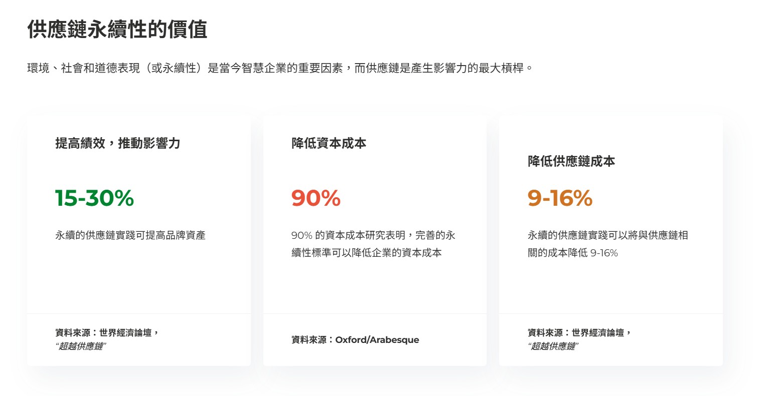 - 永續供應鏈能有效提升品牌資產價值,幫助企業在國際市場獲得更多認可。