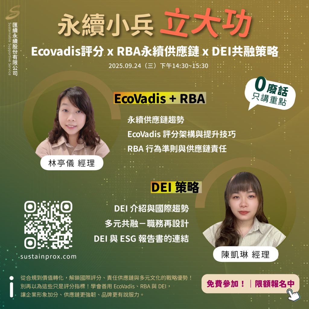 從合規👉到價值轉化,解鎖✔️國際評分、責任供應鏈與多元文化的戰略優勢!❌別再以為這些只是評分指標!學會善用 EcoVadis、RBA 與 DEI,讓企業形象加分、供應鏈更強韌、品牌更有說服力。