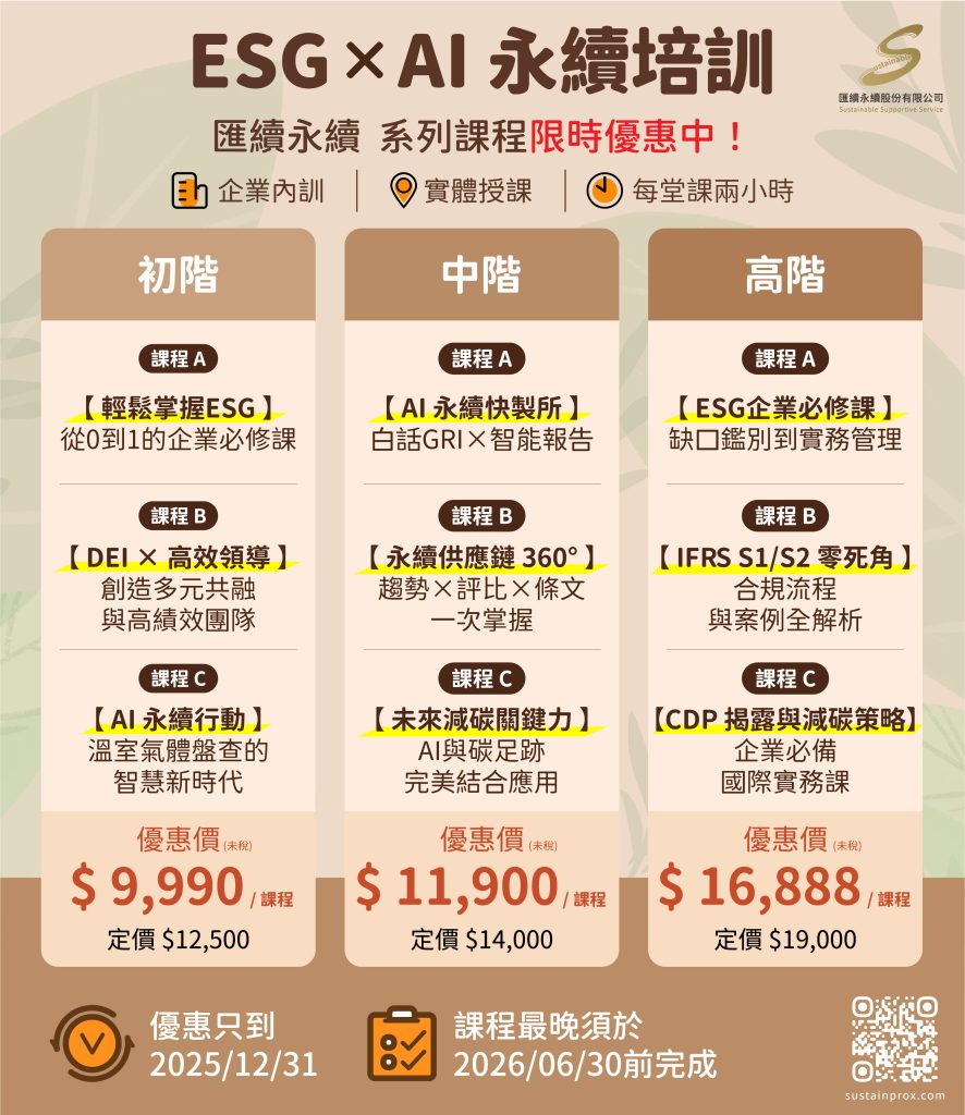 國際永續法規與市場需求日趨嚴峻,企業必須具備📌快速回應、📌合規揭露與📌減碳行動的能力。🎉匯續永續特開「ESG × AI 永續培訓」系列課程,針對不同成熟度的企業需求,規劃✨初階 × 中階 × 高階 三大模組,每個模組各提供👏三門課程供企業依照需求做選擇,協助企業從入門到實戰全面提升永續硬實力。