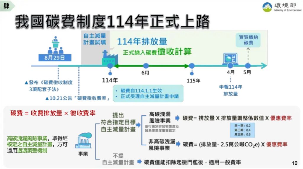 目前 K 值為 25,000 公噸CO₂e,基本費率為 每噸 300 元;若企業達成「自主減量計畫」目標,可申請優惠費率 50 元或 100 元。