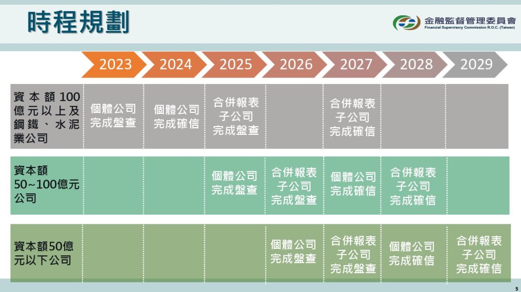 根據金管會於 2022–2023 年間發布的《上市櫃公司永續發展路徑圖》及配套行動方案,企業依實收資本額與產業別分階段揭露盤查與確信資訊。