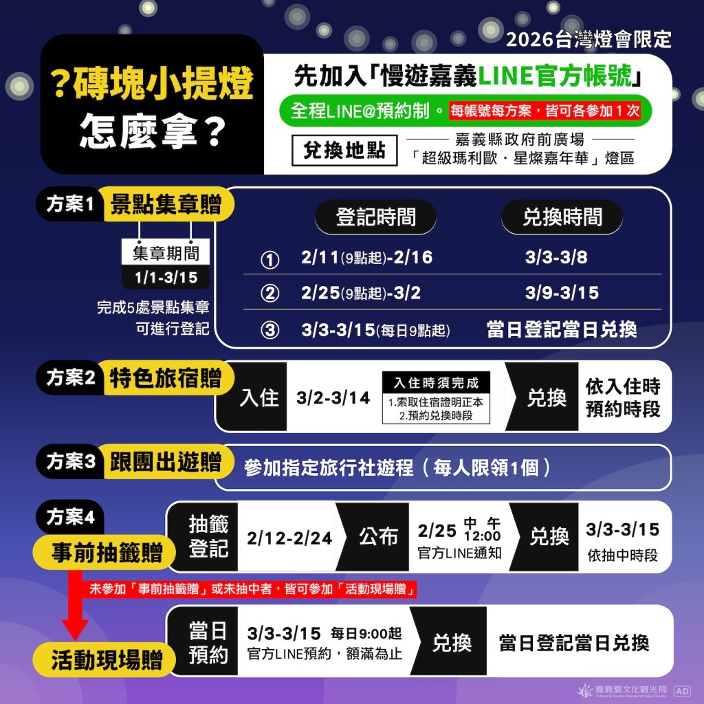 不想自己排行程,喜歡跟著旅行社走的人直接報名與嘉義縣政府合作之指定旅行社的「台灣燈會專屬團旅行程」,由旅行社直接安排贈送,無腦輕鬆拿!
